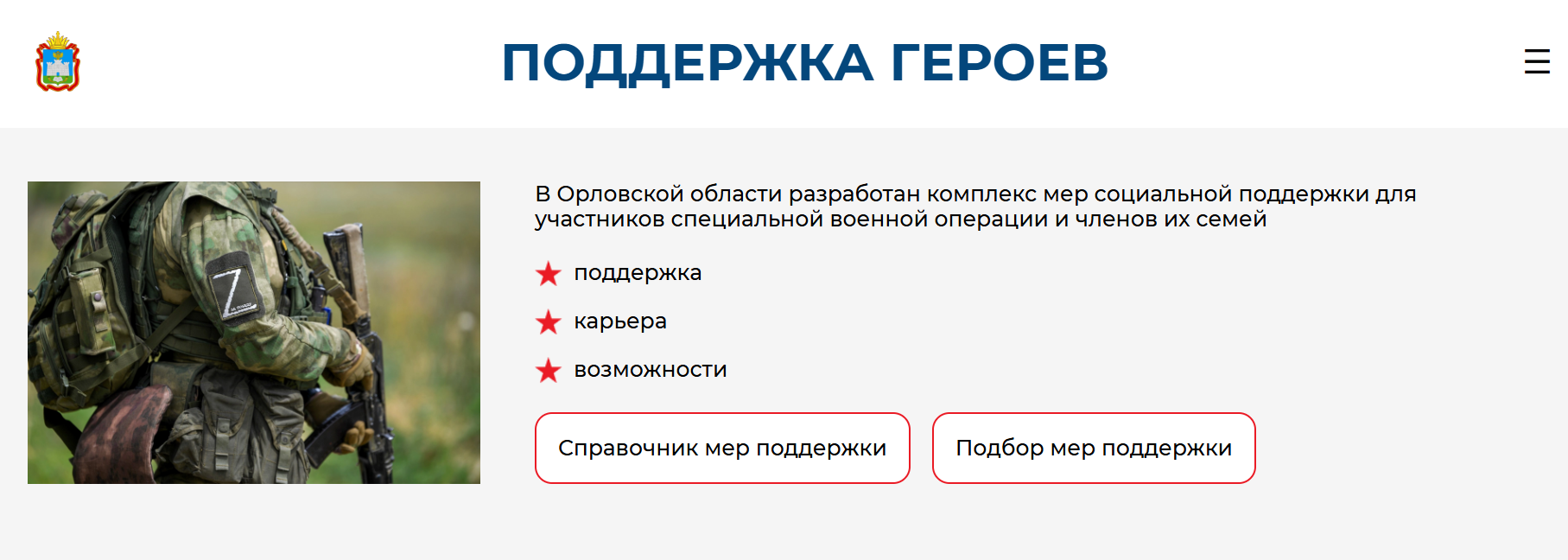 Официальный адрес портала "Поддержка героев" доступен по ссылке: https://heroes.orel-region.ru/